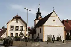 Der Chorturm stammt aus dem 12./13. Jahrhundert. Er wurde ab 1736 umgestaltet und dabei mit einem Pyramidendach versehen, dessen Dachgaube das Ziffernblatt der Turmuhr enthält. Darauf wurde ein achteckiger, schiefergedeckter Dachreiter gesetzt, der hinter den allseitigen, stichbogigen Klangarkaden den Glockenstuhl beherbergt. Den oberen Abschluss bildet ein achtseitiger Spitzhelm. An den Chorturm wurde im Jahr 1750 das sattelgedeckte Langhaus angebaut. Die 1973 entdeckten spätgotischen Wandmalereien im Inneren wurden wieder überputzt. 1980 wurde die Kirche renoviert.