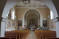 Die 1847 nach einem Plan von Anton Kappeler gebaute Saalkirche im Rundbogenstil besteht aus einem Langhaus, einem eingezogenen, quadratischen Chor im Norden, der sich in einer halbrunden Apsis fortsetzt, und einem Fassadenturm, der im Süden halb in das Langhaus eingestellt ist, auf quadratischem Grundriss. Er wurde mit einem achteckigen Geschoss aufgestockt, das die Turmuhr und den Glockenstuhl mit vier Kirchenglocken beherbergt, und mit einem spitzen Zeltdach bedeckt. Im Vestibül hinter dem Portal, dem Erdgeschoss des Fassadenturms, befindet sich ein Wappenstein für einen Fugger von Kirchberg. Die Orgel stammt von Georg Weishaupt.[1]