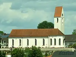 Die spätgotische Saalkirche besteht aus dem 1923 um zwei Joche nach Westen verlängerten Langhaus, dem eingezogenen, dreiseitig geschlossenen Chor im Osten und dem mit einem Satteldach bedeckten Chorflankenturm an der Nordwand des Chors. Sein oberstes Geschoss enthält den Glockenstuhl. Die Zifferblätter der Turmuhr sind an den Giebeln angebracht.