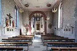 Die Saalkirche besteht aus einem Langhaus und einem eingezogenen, dreiseitig geschlossenen Chor im Osten, die von 1612 bid 1614 erbaut wurden, und einem Chorflankenturm im Norden des Chors, dessen untere Geschosse aus dem 12./13. Jahrhundert stammen und der in der zweiten Hälfte des 15. Jahrhunderts erstmals aufgestockt wurde. Sein oberstes Geschoss, das die Turmuhr und den Glockenstuhl beherbergt, und die Welsche Haube erhielt er erst 1779. In der zweiten Hälfte des 19. Jahrhunderts wurde im Westen des Langhauses für das Vestibül ein neugotischer Anbau mit einem Staffelgiebel errichtet.
