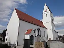 Die im 15. Jahrhundert errichtete und 1723 nach Westen verlängerte Saalkirche besteht aus einem Langhaus, das mit einem Satteldach bedeckt ist, von dem Teile des romanischen Vorgängerbaus verwendet wurden, einem eingezogenen, dreiseitig geschlossenen Chor im Osten und einem Chorflankenturm an der Südwand des Chors. Der Innenraum des Langhauses ist mit einer Flachdecke überspannt, der des Chors mit einem Tonnengewölbe. Die um 1780 angebrachten Fresken stammen von Johann Baptist Anwander. Das um 1610 entstandene Triptychon ist mit Tafelbildern versehen. In der Mitte ist die Auferstehung Jesu Christi dargestellt. Auf den Flügeln sind innen Laurentius von Rom und Katharina von Alexandrien, und außen der heilige Georg und Anna selbdritt zu sehen.