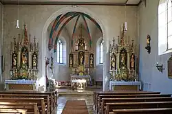 Die Kirchenausstattung wurde 1866/68 neugotisch gestaltet. Der nördliche Seitenaltar mit einem Marienbildnis auf dem Altarretabel aus der Mitte des 15. Jahrhunderts blieb erhalten.