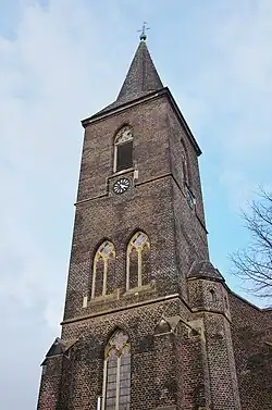 Die Pfarrei ist seit 1276 urkundlich nachgewiesen. Der vierjochige Saalbau in neugotischen Formen, mit einem Chor im 5/8-Schluss, wurde 1865 unter der Leitung von Emil von Manger aus Ziegeln errichtet. Das Gebäude wird von einem mit Naturschiefer eingedecktem Satteldach bedeckt. Der Chor ist niedriger, als das Schiff. Im Südosten ist eine Sakristei angebaut. Im Westen schließt sich der Fassadenturm unter einem Helmdach an; sein Grundriss ist quadratisch.