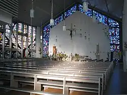 1998 wurden nach einer umfangreichen Außensanierung und der Neugestaltung des Eingangsbereiches auch der Innenraum neu gestaltet. Der Kunstreferent des Bistums Würzburg, Domkapitular Jürgen Lenssen entwarf zusammen mit den Architekten Oskar Herbert und Thomas Buchholz Pläne, die den Altar nach Norden gerichtet, vor die Betonglaswand stellen sollten. Später entschied man aber die Ost-West-Richtung beizubehalten. Auf einem Podest ausgehend vom Chor wurde der Altar „verus populum“ mit Evangeliarstele und Ambo in die Mitte der Gemeinde gerückt. In der Mitte des ehemaligen Chorraums sind die Sedilien (Priestersitz und Ministrantenbänke) angeordnet, rechts die Tabernakelstele, sie wurde erhöht und mit kubischen Stilelementen verziert, links die Marienstatue, an der Chorwand die Apostelleuchter. Über dem Altar wurde ein modernes Kreuz angebracht an dem der vorhandene Korpus hängt. Die Kirchenbänke (um 200 Sitzplätze verringert) wurden in U-Form um den Altar gestellt. Das Taufbecken aus dem Jahr 1607 wurde aus der Seitenkapelle in die Mitte des Eingangsbereichs versetzt. In Gegenüberstellung des siebenarmigen Kerzenleuchters begegnen sich hier symbolisch Alter und Neuer Bund.[1]