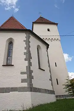 Das im Kern spätromanische Langhaus der Saalkirche wurde im 13. Jahrhundert erbaut. Der dreiseitig geschlossenen Chor im Osten und der Chorflankenturm auf quadratischem Grundriss an seiner Nordwand wurden erst um 1450 angebaut. Der Chorflankenturm wurde über einem Bogenfries mit einem leicht vorkragenden Geschoss aufgestockt und mit einem Pyramidendach bedeckt.