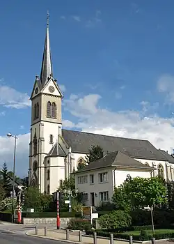 Mit steigender Einwohnerzahl (um 1900 über 1500 Einwohner), wurde der Bau einer Kirche beschlossen, die 1905 geplant und bis 1907 um etwa 100.000 Franc errichtet wurde (Architekt: Jean-Pierre Knepper). Grundsteinlegung war am 17. Mai 1906 durch den damaligen Bürgermeister Robert Collart. Noch während des Baues erhielten die Unternehmer und Hüttenbesitzer (Steinforter Hüttenwerk) Robert bzw. Jules Collart die Genehmigung, eine eigene Kapelle an die Pfarrkirche mit einem eigenen Eingang zur Kirche anzubauen.[1]