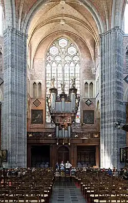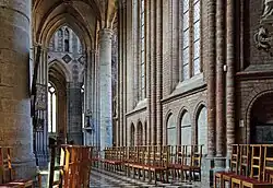 Der Hauptchor zeigt einen dreiteiligen Aufriss: Spitzbogenarkaden aus nordfranzösischem Kalkstein auf Tournai-Pfeilern mit achteckiger Basis, darüber das Triforium aus Kalkstein mit Arkade aus Spitzbögen auf Säulen und gemauertem Reliefbogen, zuoberst spitzbogige Obergadenfenster auf profilierten Kalksteinbändern und neueren Sohlbänken (1939–1940). Die Vorhalle und Kapellen sind mit zweiteiligem Aufriss ausgebildet: drei spitz- und rundbogige Nischen sind mit durchgehenden Fensterbänken pro Joch ausgebildet, die spitzbogigen Fenster sind mit originalen Gewänden erhalten. In der Südwand des Altarraums ist ein 1529 zugemauertes dreiteiliges Spitzbogenfenster mit erhaltenem gotischem Maßwerk zu sehen.