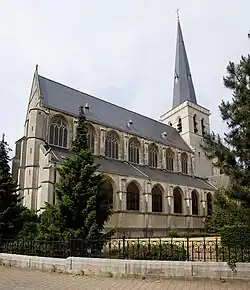 Die Kirche ist eine geostete kreuzförmige Basilika mit quadratischem Vierungsturm aus Balegemer Sandstein, einem dreischiffigen Kirchenschiff mit sieben Jochen, einem niedrigen Querschiff mit zwei Jochen und dem Chor mit drei geraden Jochen; gegenüber dem Chor sind untere Seitenkapellen und eine Sakristei erbaut, eine Taufkapelle im Nordwesten. Das Bauwerk ist mit Schiefer gedeckt. Die Joche sind rhythmisch durch abgestufte Strebepfeiler gegliedert, außerdem sind durchgehende Gesimse, Gerüstlöcher (Kirchenschiff und Turm) und Spitzbogenfenster mit einem Gesims und gotischem Maßwerk verwendet, darunter ein Dreipassmotiv und ein Fischblasenmotiv. Der Westgiebel ist gestaltet mit bekrönendem Kreuz, zwei rechteckigen Türen unter einem spitzbogigen Blendenfeld, Pendentif mit Dreiviertelsäule und bekrönender dreiteiliger Nische, in der die Statue des Schutzpatrons (1978, M. Peeters) steht, alles eingerahmt von profiliertem Spitzbogenrahmen. Weiter oben ist ein breites mehrbahniges Maßwerkfenster, ein polygonaler Treppenturm ist im Süden angeordnet. Die nordwestliche Kapelle mit Pultdach ist mit einer Korbbogentür in profiliertem Gewände an der Nordseite versehen. Die Gewölbe des Kirchenschiffs und des Chors enden auf markanten äußeren Strebepfeilern, die sich durch die Gewölbe der Seitenschiffe ins Innere als Konsolen fortsetzen und auf den Kapitellen der Säulen enden. Die bündig abschließenden Querhausarme sind mit einer spitzbogigen Tür im nördlichen Querhausarm in profiliertem Gewände mit einer Marienstatue (1880, L. Bartels) und mit einem Holzkruzifix (1854) an der Westwand versehen.