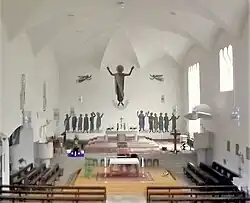 Im geräumigen, erhöhten Chor der Kirche steht der als einfacher Tischaltar gestaltete Altar aus weißem Marmor.[2] Für die 1955 ausgeführte Ausmalung des Altarraums mit der Darstellung der Himmelfahrt Christi, die alle Völker als Erlöste Christi einschließt, zeichnete der Künstler und Kunstprofessor Boris Kleint (Saarbrücken) verantwortlich. Von Maler Albert Kettenhofen (Merzig-Harlingen) stammt die Mosaik-Wand im Chorraum.[3]