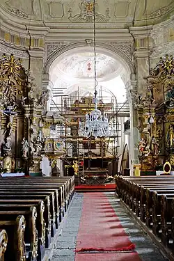 Der barocke Hochaltar von 1759 stellt das Gemälde „Ermordung des heiligen Wenzels“ vom Maler Peter Johann Brandl dar.[5] Das gemalte Antependium „Heilige Dreifaltigkeit“ von 1744 schuf der Künstler Elias Dollhopf.[6] Die reich verzierten Seitenaltäre zeigen im Zentrum ein Kruzifix und eine Madonna.