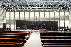 Auf der Altarinsel stehen der Tabernakel, das Taufbecken, ein Ambo und die Osterleuchter. Hinter der Altarinsel steht eine breite kupferne Reliefwand, sie stellt die Zuhörer der Bergpredigt dar. Dahinter befindet sich im Kirchenraum selbst die Sakristei.