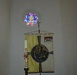 Ein Charakteristikum der Kirche sind die Bullaugen-artigen Rundfenster in der Seitenkapelle und im Altarraum. Eines der Fenster im Altarraum zeigt in farbiger Verglasung den Kirchenpatron in der zweiten Phase seines Lebens als bärtigen Mönch mit deutlicher Tonsur, die eine Hand zum Gelöbnis erhoben.
