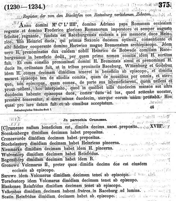 Groß Grönau („Gronowe“) wird zum ersten Mal urkundlich erwähnt im Ratzeburger Zehntregister des Bischofs von Ratzeburg 1230. Damals gehörte der Ort noch zur Parochie Krummesse, hatte wohl aber mit dem erwähnten „Volcmarus“, dem die Hälfte des Zehnten von Grönau, „Sarowe“ und „Toradestorp“ zustand, bereits einen eigenen Priester.[1] Wenig später war Grönau ein selbständiges Kirchspiel, zu dem außer den bereits genannten Dörfern auch die Lübecker Dörfer Klein Grönau, Blankensee, Falkenhusen und Schattin gehörten.