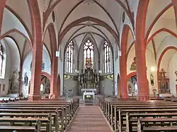 Die Wände im Inneren sind weiß gehalten, wobei die Kanten backsteinfarbig ausgemalt sind. Verstrebungen, Gewölbegrate und Gurtbögen werden von ornamentalen Bemalungen begleitet. Der neugotische Hochaltar im Chorraum wird von barocken Seitenaltären flankiert, die aus der alten Pfarrkirche stammen. Auf dem Bild des linken Seitenaltares sind die 14 Nothelfer zu sehen, die sich um das gekreuzigte Jesuskind versammeln. Der rechte Seitenaltar ist dem heiligen Hubertus gewidmet. Vor dem Hubertusaltar steht der Taufstein der Kirche, der in den 1960er Jahren aus der früheren Taufkapelle, die zur Gedenkstätte für die Opfer der Weltkriege wurde, an den heutigen Standort versetzt worden war. Aufgrund des Zweiten Vatikanischen Konzils kam es in den 1960er Jahren zu weiteren Umbaumaßnahmen in der Kirche. So wurden die steinernen Chorschranken und die Kanzel entfernt.[4]