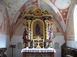 An der Ostwand, teilweise vom Hochaltar verdeckt, ist links die Heimsuchung Mariens zu sehen, deren Farben nahezu vollständig verblasst sind. Das Motiv ist heute nur noch anhand der Rötelzeichnung erkennbar. In der Mitte über dem kleinen Fenster ist ein rauchfassschwingender Engel dargestellt; die Fensterlaibung ist mit Rankwerk ausgefüllt. Rechts sind Maria und Josef auf der Wanderung dargestellt. Auch in der Chorbogenlaibung wurde bei der Freilegung der Fresken um 1900 Rankwerk festgestellt; in die noch erkennbaren Medaillons waren zuvor neugotische Heiligenbilder gemalt worden.[2][4][6]