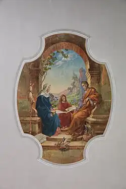 Das Deckengemälde Heilige Familie des Staffelsteiner Künstlers Hans Theodor Stengel von 1902 im Langhaus hat einen ovalen Deckenbildrahmen aus Stuck mit vier Einbuchtungen.