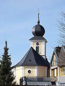 Die nach Südosten gerichtete, barocke Saalbaukirche steht in der Ortsmitte und hat eine aus der Flucht der Dorfstraße hervortretende Einturmfassade.