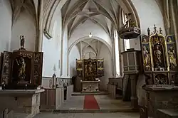 Der Flügelaltar im Chor wurde 1514 gebaut. Die drei Skulpturen im Mittelteil des Altars stellen den Kirchenpatron Wolfgang als Bischof dar, er wird flankiert von den beiden Pestheiligen Sebastian und Rochus von Montpellier. Die vier Gemälde auf den Flügeln erzählen Ereignisse aus dem Leben Wolfgangs. Das figurenreiche Bild in der Predella zeigt Jesus unter seinem Kreuz, die Häscher, sowie Johannes und die beiden Marien auf der einen und Veronika auf der anderen Seite. Sie stammen von Wilhelm Ziegler.