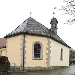 Das rundbogige Westportal besitzt als Schlussstein eine Volute mit der Jahreszahl 1707, darüber sitzt eine Kugel. Im oberen Teil der Westfassade befindet sich ein Sandsteinrelief mit dem Amtswappen des Bamberger Fürstbischofs Lothar Franz von Schönborn und mit der Jahreszahl 1710 in der Inschrift. Daneben sind querovale Fenster angeordnet. Ein verschiefertes Satteldach bildet den oberen Abschluss. Über dem verschieferten Giebelfeld steht ein sechsseitiger Dachreiter mit einer geschwungenen Kuppel.[5]