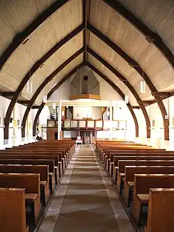 Die verputzten Langhauswände haben fünf Fensterachsen mit hochrechteckigen Fenstern, gerahmt von schmalen Ziegelstreifen. Die Westfassade ist gegenüber der Kapellenfassade um eine Steinlage nach innen versetzt. Zwischen den beiden südlichen Fenstern befindet sich ein Rundbogenportal, links davon ein Relief mit dem Wappen von Erzbischof Jacob von Hauck und der Jahreszahl 1934. Den glatt verputzten und hell gefassten Innenraum überspannt ein hölzernes, kielbogenförmiges Tonnengewölbe, das gegenüber der Raumbreite leicht eingezogen ist. Sieben dunkel gefasste Holzbinder, die zwischen den Fenstern angeordnet sind und auf Steinkonsolen ruhen, tragen das Gewölbe und die Dachkonstruktion.[1]