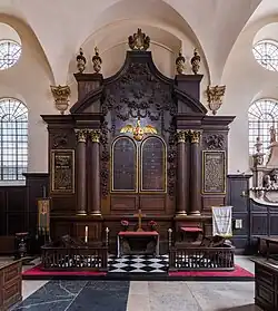 William Grey schuf die Kanzel. Türrahmen, der Deckel des Taufbeckens, Verzierungen und das königliche Wappen stammen von William Emmett. Der Hauptaltar ist ein Werk von Grinling Gibbons.[17] Gibbons’ originale Rechnung – von ihm die Olter Pees genannt – wurde in der Guildhall Library 1946 wiedergefunden. Das Motiv des vergoldeten Pelican in her piety (frei übersetzt: Pelikan in seiner Hingabe) erscheint auf dem Retabel und auf der originalen kupfernen Wetterfahne aus der Fertigung von Robert Bird. Sie wurde von der Turmspitze aus Sicherheitsgründen entfernt und über der nördlichen Tür angebracht. An drei Seiten der Kirche finden sich die originalen Kastenbänke.