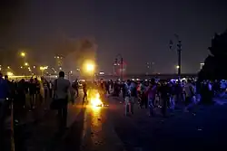 • 30. Juni 2013: Zum einjährigen Bestehen der Amtszeit von Präsident Mursi versammeln sich nach der Unterschriftenkampagne der „Tamarod“-Kampagne Hunderttausende zu Massenprotesten, um den Rücktritt Mursis zu fordern.[82] In den Medien wird auch von „Millionen“ Protestteilnehmern gesprochen.[38][83][59] Zeitgleich finden Solidaritätskundgebungen für Mursi statt.[59] Acht Menschen kommen bei Auseinandersetzungen und Schießereien vor dem Hauptquartier der Muslimbruderschaft in Kairo ums Leben.[84][83]