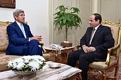 Ende März kündigte Militärchef Sisi offiziell an, bei der Präsidentschaftswahl zu kandidieren. Er werde dafür seinen Posten als Armeechef niederlegen und als Verteidigungsminister und Vize-Ministerpräsident zurücktreten.[32] Es gab nur einen weiteren Kandidaten für das Amt, Hamdin Sabahi. Sisi erhielt fast 97 Prozent der abgegebenen Stimmen.[33]