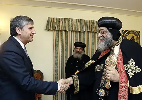 • 22. November 2012: Mursi entscheidet, die Machtbefugnisse der Justizgewalt mit einem Verfassungszusatz einzuschränken und versucht Generalstaatsanwalt Abdel Meguid Mahmud zu entlassen, indem er ihn zum ägyptischen Botschafter im Vatikanstaat benennt.[57][38][50][62][63][64] Nachdem Mahmud und andere Richter Mursi, der nach ägyptischen Gesetz nicht die Verfügungsgewalt besitzt, den Generalstaatsanwalt zu entlassen, herausfordern, gibt Mursi nach.[57] Öffentliche Unruhen zwingen Mursis zu einer Wende bei einigen Vorschlägen.[38][50][62][63][64]