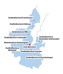 Neben der Zentralbibliothek gibt es sieben Stadtteilbüchereien und zwei Kinderbüchereien, die das Bibliothekssystem der Stadtbücherei Kiel bilden: