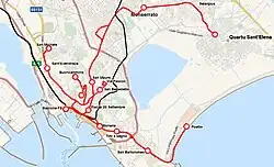 • Linie 2: San Mauro–Bacaredda–Piazza Garibaldi–Via Sonnino–Via Roma–Largo Carlo Felice–Piazza Yenne