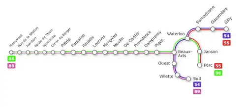 | Yernaux | vsl. 2027 | Strecke nach Les Viviers | Fertigstellung 1987 unter dem Stationsnamen Chet,[37] nicht eröffnet. Sanierung seit 2023, Fertigstellung 2025.[24][36] Nach dem Stadtplaner und Stadtbahn-Architekten Jean Yernaux benannt. |