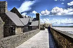 Insbesondere während des Hundertjährigen Kriegs war die Stadtbefestigung militärischen Angriffen ausgesetzt. 1419 lief Abt Robert Jolivet, der zuvor die Befestigung hatte ausbauen lassen, zu den feindlichen Engländern über. Trotzdem gelang es, die Festungsanlage zu verteidigen, die neben den baulichen Anlagen auch durch die ständig wechselnden Gezeiten geschützt wurde. Im Jahr 1434 wurde ein baldiger Sieg der die Festung belagernden Engländer erwartet. Durch feindlichen Beschuss, es wurden Kanonenkugeln mit einem Gewicht von bis zu 150 Kilogramm verwendet, war eine Lücke in die Mauern geschlagen worden. Durch diese Bresche unternahmen die Verteidiger einen erfolgreichen Ausfall, der die Engländer zum Rückzug zwang. Dabei wurden zwei große Geschütze, die Michelettes, erbeutet, die heute neben dem Königstor aufgebaut sind.[5] Letztlich fiel Mont-Saint-Michel im gesamten Krieg nie an die Engländer.