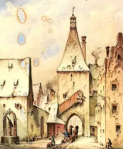 - ↑ Die Halbrundtürme wurden in der Zeit der Neugotik mehrfach verändert. Es wurden pseudo-gotische Maßwerkfenster und Zinnen eingebaut, das alte Vortor entfernt, zwei Fußgängerpforten und eine spitzbogige Durchfahrt eingebaut, die 1903 wieder für die Oberleitung der Straßenbahn entfernt werden musste. Die meisten Teile der neugotischen Überformungen verschwanden 1957.