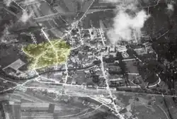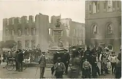 Die Käferstraße, etwa von der Kreuzung mit der Wöhrdenstraße bzw. Wasserstraße aus. Links das Anwesen Marie Engeßer, der Brandherd. Daneben, Bildmitte, die Ruine der Restauration Kuttruff. Ganz hinten rechts das Amtsgefängnis mit dem markanten Turm. -