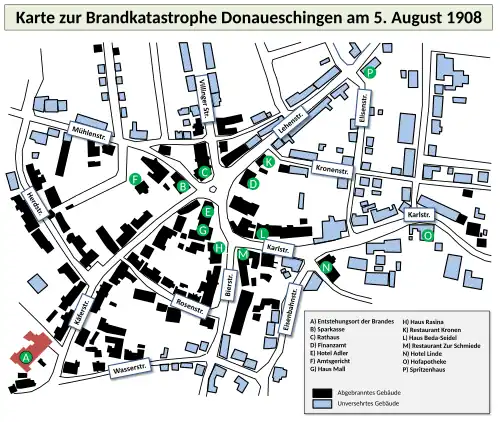 - ↑ Die Brandkatastrophe in Donaueschingen. In: Badische Presse – Mittagsblatt. Nr. 365, 12. August 1908, S. 3, Spalte 2, untere Mitte (Digitalisat in der Badischen Landesbibliothek).