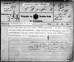 „Seiner Majestät dem Kaiser Berlin Melde Eurer Majestät alleruntertänigst mit tiefbekümmerten Herzen dass eben unsre Stadt Donaueschingen fast zur Hälfte niedergebrannt ist. Hunderte von Menschen sind obdachlos. Schloss und Brauerei bisher gottlob unversehrt geblieben. Euer Majestät in tiefster Ehrfurcht gehorsanster [sic] Diener“