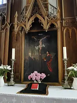 Der hölzerne Kanzelaltar mit gemauertem Altartisch ist vermutlich von 1844.[24] Die hölzerne Altarwand mit durchbrochenem Schnitzwerk hat zwei Durchgänge zur Sakristei und Empore. Mittig steht die Kanzel unter einem mit gotisierendem Schnitzwerk verzierten Baldachin. Unter der Kanzel befindet sich ein zeitgenössisches Leinwandgemälde mit der Darstellung des gekreuzigten Christus eines unbekannten Malers. Die hölzernen Elemente des Altars und der Altarwand sind mit einer Holzimitationsmalerei versehen, die ursprünglich noch verziert war.[25]