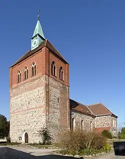 Die Kirche hat einen kreuzförmigen Grundriss mit rechteckig ohne Apsis schließendem Chor, Querhaus, Langhaus und einem dessen Breite übertreffenden querrechteckigen Westturm. Der Chor weicht in seiner Längsachse von der Achse des Langhauses ab, was vielerorts mit theologischer Absicht erklärt wird. Die Feldsteinmauern der Kirche sind bis zu 1,3 Meter stark.