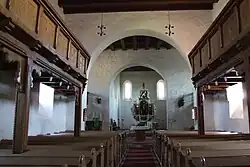 Im Gegensatz zu den Fassaden zeigt der flach gedeckte Kirchenraum innen nur romanische und neuzeitliche Gestaltung. Auffälligerweise gibt es keine „ausgeschiedene“ Vierung, sondern nur zwei Triumphbögen, einen zwischen Schiff und Querhaus und einen zwischen Querhaus und Chor.