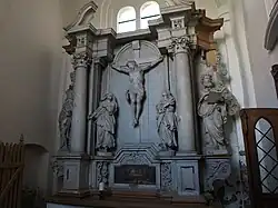 Erhalten ist der hochbarocke Altaraufsatz aus dem Jahr 1718. Der Altar ist vollständig aus Eichenholz gefertigt und von hellgrauer Farbe. Im Hauptfeld zeigt er die kunstvoll ausgeführte Darstellung einer Kreuzigungsgruppe. Das Hauptfeld flankierend, die auf barocken Konsolen ruhenden lebensgroßen vier Evangelisten. Über den von korinthischen Säulen getragenen Gebälk, das mit Halbfiguren und Akanthusornament verziert ist, erhob sich die von Engelsfiguren flankierte Christusfigur als Triumphator.