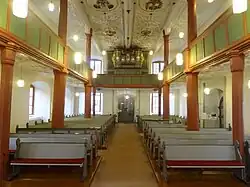 Der Innenraum wird von einer stuckierten Flachdecke mit drei Längsunterzügen abgeschlossen, die auf Holzpfeilern ruhen, die eine dreiseitig umlaufende Empore einbeziehen. Die Emporenbrüstungen haben kassettierte Füllungen. Die Emporenstützen sind achtseitig, während die Decke von vier Rundsäulen aus Eiche getragen wird. Die weiße Stuckdecke zeigt reiche geometrische Verzierungen und Medaillons. Sie wird in den mittleren beiden Stuckfeldern mit den polychromen Wappen des Landgrafen Ludwig V. und seiner Frau Magdalena von Brandenburg verziert.[19] Sie werden von Schriftfriesen umrahmt: „SACRA DEO DOMVS HAEC LVDOVICO PRINCIPE FACTA EST HANC VT ET HVNC DEXTRA PROTEGE CHRISTE TVA“ (Dieses Gott geweihte Haus ist unter dem Landgrafen Ludwig erbaut worden. Christus schütze es und ihn mit deiner Rechten) und „MAGDALIS ILLVSTRIS LVDOVICI PRINCIPIS VXOR BRANDENBVRGIACO STEMMATE NATA FVIT“ (Magdalena, des erlauchten Landgrafen Ludwig Gemahlin, ist geboren aus brandenburgischem Geschlecht).[20] Die benachbarten Vierpässe zeigen zweimal kreuzweise einen vergoldeten Doppeladler mit einer silbernen Krone als Symbol des Reiches und als Symbol für die sich aufopfernde Liebe Christi einen Pelikan mit seinen Jungen, um dessen Füße sich eine Schlange windet. Die Jahreszahl in der Inschrift „1616 MORTVOS VIVIFICO“ (Die Toten mache ich lebendig).[10] weist offensichtlich auf das Todesjahr der Landgräfin.[21] Unterhalb der Empore sind ebenfalls Stuckarbeiten angebracht. Dieselbe Arbeitsweise wie in den Kirchen zu Niederweisel und Wohnbach lässt dieselbe Werkstatt vermuten.[20]
