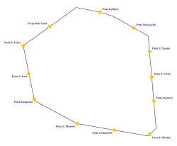 - Porta di San Cassiano, später umbenannt in Porta Piera oder Porta di San Pietro, da sie in der Nähe der Kathedrale San Pietro log