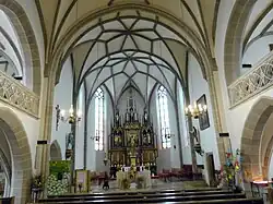 Die Kirche besteht aus unverputztem Bruchsteinmauerwerk mit neugotischen Anbauten. Das Mittelschiff hat ein Schopfwalmdach, die Seitenschiffe niedrige Pultdächer. Der hohe Kirchturm ist 4-zonig mit neugotischen Fenstern und hat ein pyramidenförmiges Turmdach. An der Außenwand befinden sich die ehemaligen Turmkreuze und eine Gedenktafel an die ersten verstorbenen Marktbürger. Vom gotischen Vorgängerbau sind das Nordportal und das Relief mit der Ölbergszene an der südlichen Außenmauer erhalten. Das 1927 errichtete und 1959 erneuerte Kriegerdenkmal steht an der Ostseite der Kirche.