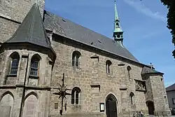 Aus einer Inschrift am Nordportal mit der Jahreszahl 1481 ist ableitbar, dass der spätgotische Neubau aus Stein unter Abt Thomas Dienstl in der zweiten Hälfte des 15. Jahrhunderts errichtet wurde. Der Kirchturm war Teil der Befestigungsanlage des Marktes und trug bis 1781 einen auf Kragsteinen ruhenden Umlauf. 1781 erfolgte eine Aufstockung und Barockisierung des Turms.