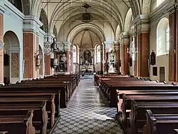 Das Langhaus besteht aus fünf Jochen. Aus der Zeit des Umbaus von 1894 weist die Kirche eine historistische Ausstattung auf, die von August von Wörndle gestaltet wurde. Der Hochaltar (1894) präsentiert ein Bild des Kirchenheiligen. Der linke Seitenaltar trägt ein Bild des heiligen Johannes Nepomuk (1720 von Carl Pflänzl), der rechte Seitenaltar ein Bild des heiligen Franz Xaver. Im Altarraum der Kirche befindet sich ein im Boden versenktes begehbares Taufbecken in Form eines griechischen Kreuzes (1997).