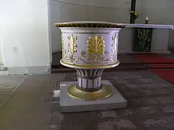 Das aus Stein gefertigte runde Taufbecken ist in gleichem Grau wie die anderen Ausstattungsstücke gehalten, außen rundherum vergoldete Ornamente als Zierde.