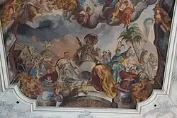 Von besonders reichem Rocaille-Stuck ist das große Deckenfresko von Johann Michael Baader aus dem Jahr 1758 eingerahmt. Es zeigt die himmlische Krönung Mariens durch Gott Vater und Jesus Christus. Vertreter der vier zur damaligen Zeit bekannten Erdteile Europa, Afrika, Asien und Amerika huldigen der Gottesmutter, ebenso der Harfe spielende König David sowie zahlreiche Engel auf Gewölk. Am oberen Bildrand ist unter einem Baldachin die Heilig-Geist-Taube dargestellt, welche die Heilige Dreifaltigkeit vervollständigt. Über der Orgelempore ist ein weiteres, etwas kleineres Fresko zu sehen. Das geschwungen berandete Bild zeigt den Harfe spielenden König David inmitten eines Engelskonzerts.[1][3]