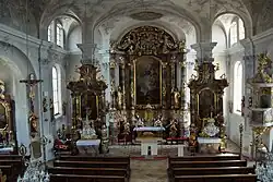 Der weite, lichte Innenraum wird von einer Flachtonne mit Stichkappen überspannt und durch ein auf Pilastern ruhendes, umlaufendes Gebälk sowie rundbogig abschließende Fensteröffnungen gegliedert. Der Chorraum befindet sich seit dem Rokokoumbau nicht mehr im Turmerdgeschoss, das für den jetzigen Hochaltar auch deutlich zu klein bemessen wäre, sondern ist in den Raum vorgerückt und wird durch zwei filigrane, quadratische Freipfeiler optisch begrenzt. An diese Pfeiler lehnen sich die äußerst flach ausgeführten Seitenaltäre an. Die beiden Seitenkapellen auf der Nord- und Südseite, jeweils von einer Quertonne überwölbt, öffnen sich rundbogig zum Hauptraum. Im westlichen Anbau befindet sich vor beiden Portalen je ein kleiner Windfang; außerdem enthält er die Orgelempore.[1][2]