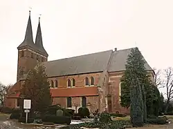 Bei der Kirche handelt es sich um einen im 13. Jahrhundert entstandenen mittelalterlichen dreischiffigen Backsteinbau mit eingezogenem fünfseitigem Chor. Im Westen des Mittelschiffs ist ein spätromanischer leicht eingezogener Westquerturm zu finden, der vermutlich einstmals zu einer ursprünglich hier vorhandenen einschiffigen Dorfkirche gehörte und von zwei verschieferten Knickhelmen gekrönt wird. Im Laufe der Zeit entstand nach mehrfachen Veränderungen eine spätgotische Backstein-Basilika. Ursprünglich besaß die Kirche drei Turmaufbauten, welche allerdings im Jahre 1590 wegen Baufälligkeit abgetragen werden mussten und durch die heutigen zwei Spitzhelme ersetzt wurden.[1][2][3] Im Jahre 1899 erfolgte eine umfangreiche Restaurierung des Bauwerks.[1]