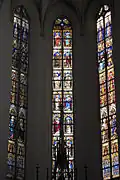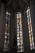 | Linke Buntglasfenster | Mittlere Buntglasfenster | Rechte Buntglasfenster |